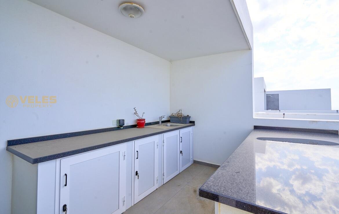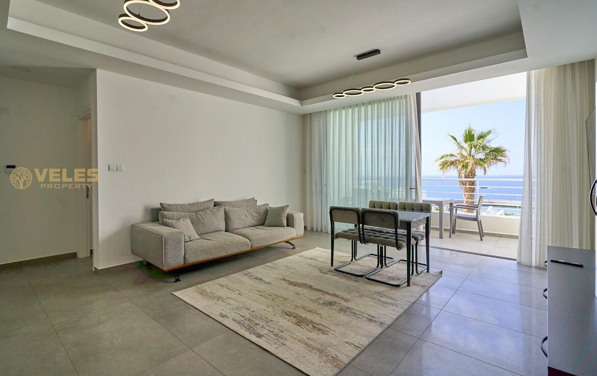 Die Wohnung umfasst eine großzügige Terrasse mit Panoramablick, zwei Schlafzimmer und zwei Badezimmer, die mit feiner Oberfläche und eingebauten Möbeln ausgestattet sind.
